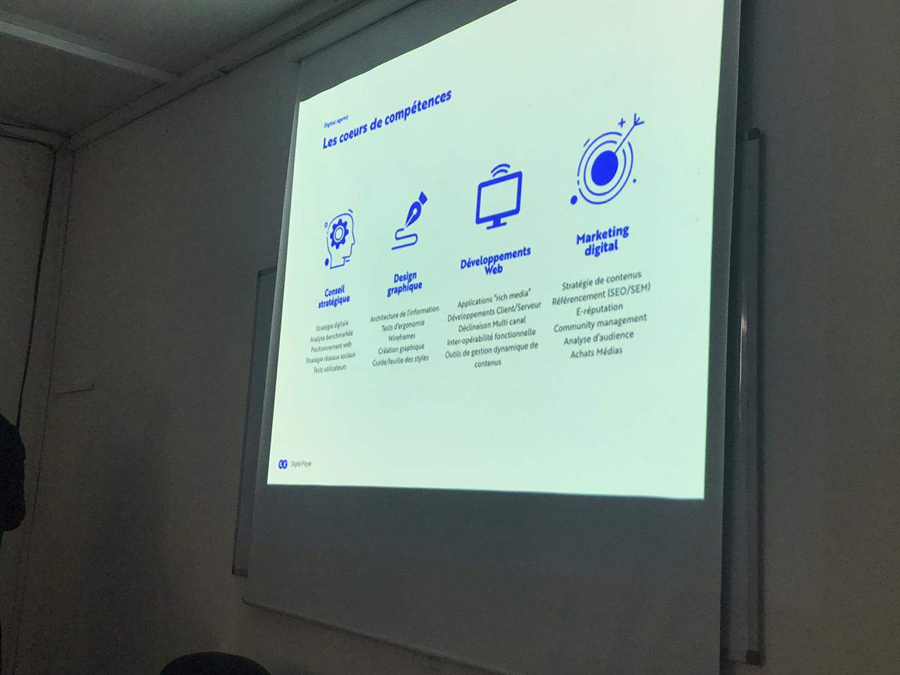 Après une présentation de l'agence, de sa vision ainsi que de ses réalisations, M Ougacem a ensuite introduit nos étudiants au graphisme et son application par les agences: "Le graphisme est une approche méthodique avant d'être une approche esthétique" affirme-t-il, en précisant que ce qui fidélise un client et le fait revenir à chaque fois à un site plutôt qu'à un autre est cette interaction qu'il a avec ce site. C'est donc sur l'expérience utilisateur (UX: penser et concevoir une interface de façon à ce que l'expérience utilisateur soit maximisée) que tout graphiste doit capitaliser, en rendant son site accessible, pratique, adapté et surtout utile.