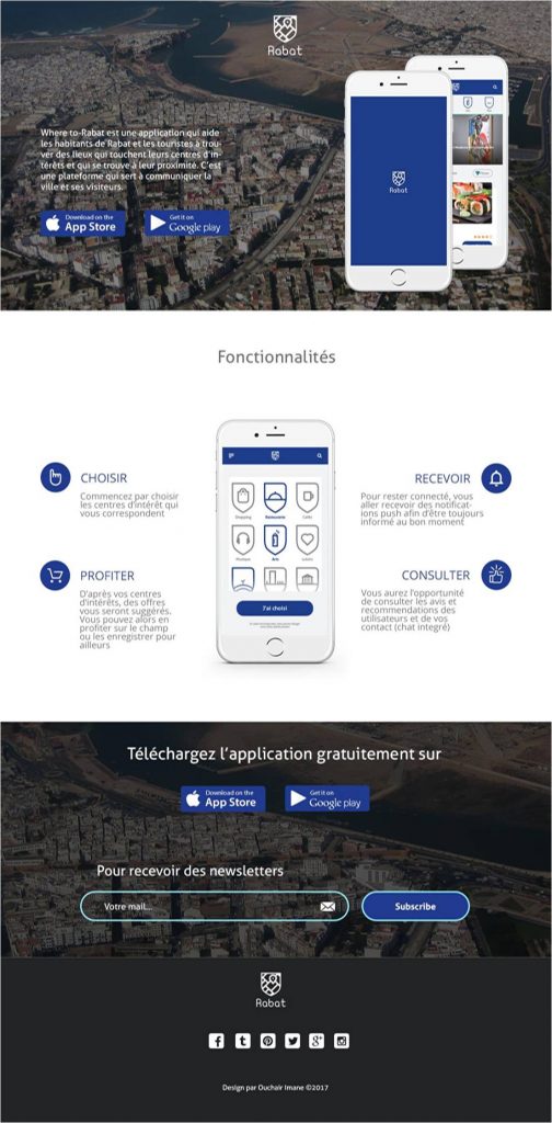 Imane, majeur de sa promotion 2ème année Master Design Graphique et Digital, a proposé un projet dont la concrétisation serait un pas de plus vers le développement et la polyvalence de la ville de Rabat. En effet, elle a retravaillé la charte graphique de la capitale administrative afin de la rendre plus attractive et plus en phase afin son orientation de ville culturelle et artistique. Pour ce, elle a proposé une application mobile dégageant les caractéristiques sur lesquelles la ville peut communiquer aux locaux comme aux touristes en visite au royaume.