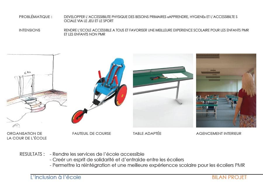 La thématique sur laquelle les étudiants ont dû travailler est une thématique d'actualité. En effet, le design social est une problématique dorénavant au coeur des projets des designers. Les étudiants ont donc du proposer un aménagement d'école primaire plus inclusif: salles de cours, terrains de sport, préau, couloirs, cour de récréation... Dès lors, le but a été de créer un aménagement durable et inclusif, convenant à une diversité d'enfants, ainsi qu'aux parcours et aux usages des professionnels de l'éducation et de la maintenance.